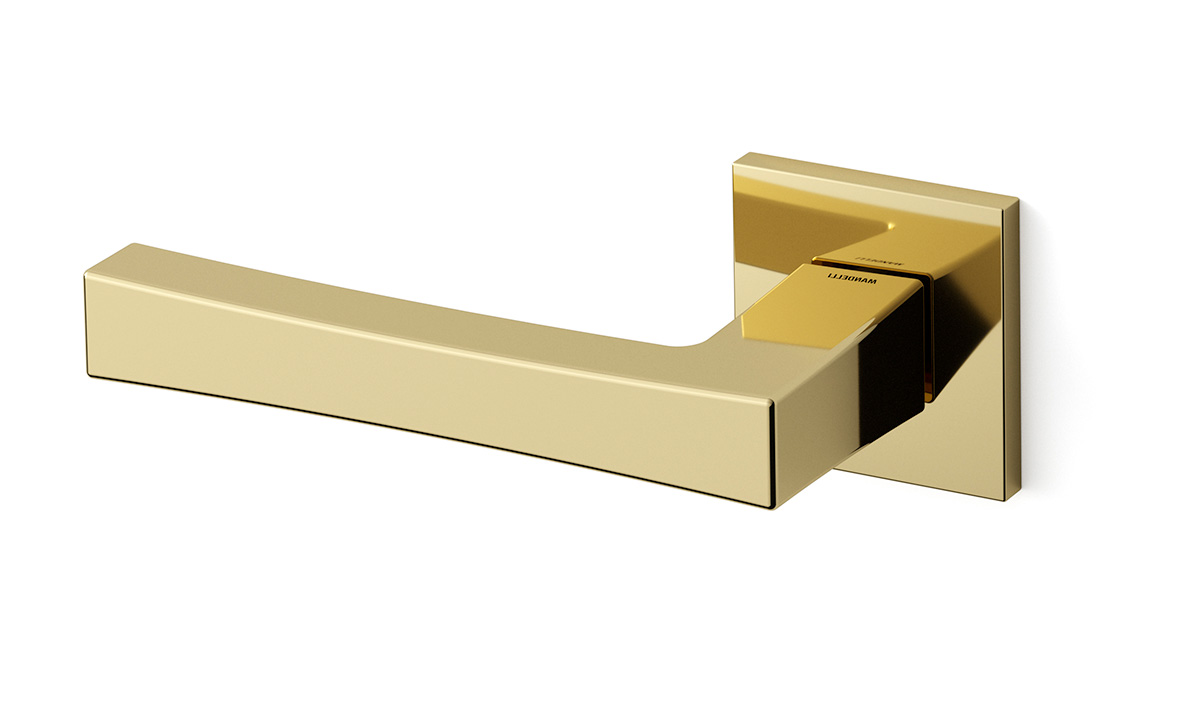 Messing gepolijst Telis deurkruk op rozet 50x50x6 mm, linkswijzend.