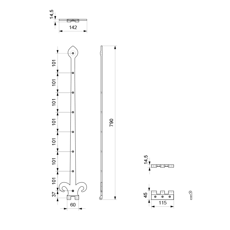 Een scharnierheng combineert het gemak van een scharnier met de uitstraling van een heng. Deze fraaie variant in zwart smeedijzer heeft een lengte van 800 mm. Het is gebruikelijk dat de scharnierheng tweederde van de deur overlapt.
