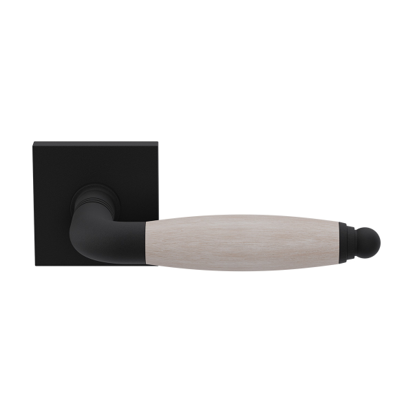 Zwart/ eiken whitewash Ika deurkruk gebogen met ronde eindknop op vierkante zwarte rozet