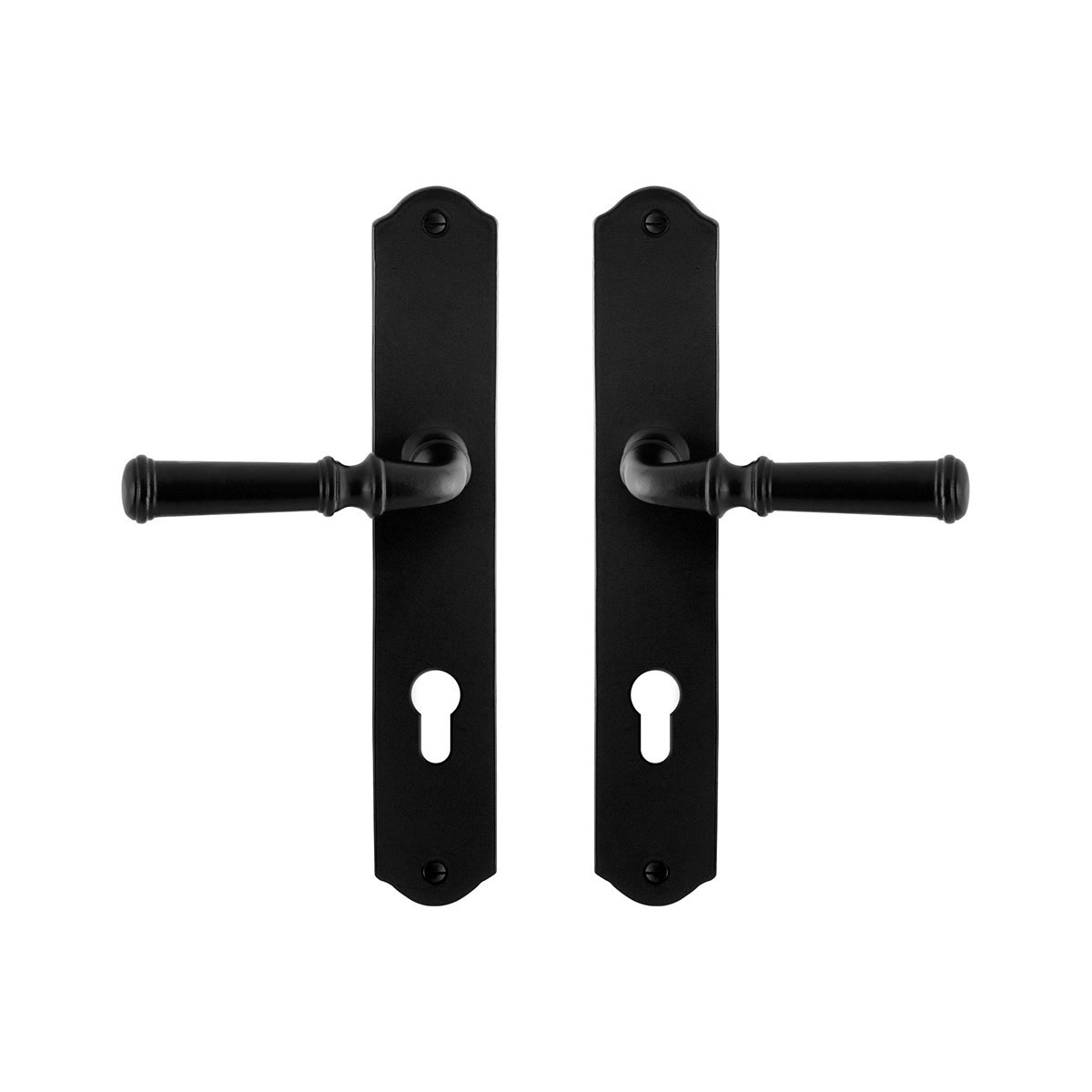 Smeedijzer zwarte deurkruk Meri op schild PC72, 238x41x4 mm.