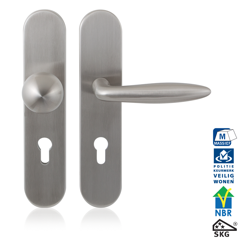 RVS matgeborsteld veiligheidsgarnituur SKG*** 248×52 mm afgerond binnen/ buiten PC55 met vaste knop GPF9854.09 + deurkruk GPF1315