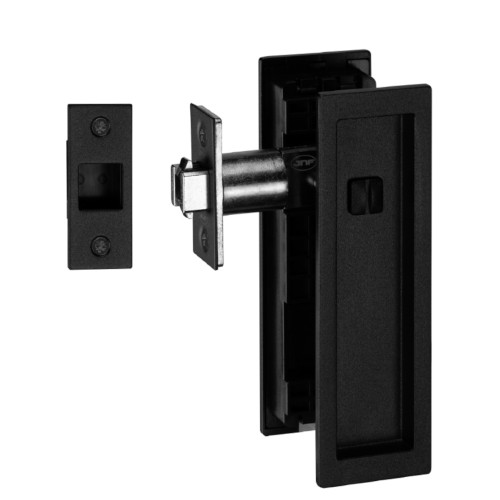 JNF IN.20.927 bad-toilet schuifdeurslot met harpoenschoot, met rechthoekig schuifdeurbeslag binnen zijde schuif om te bedienen en buiten zijde knop met gleuf voor vrij en bezet, Zwart Ral 9005