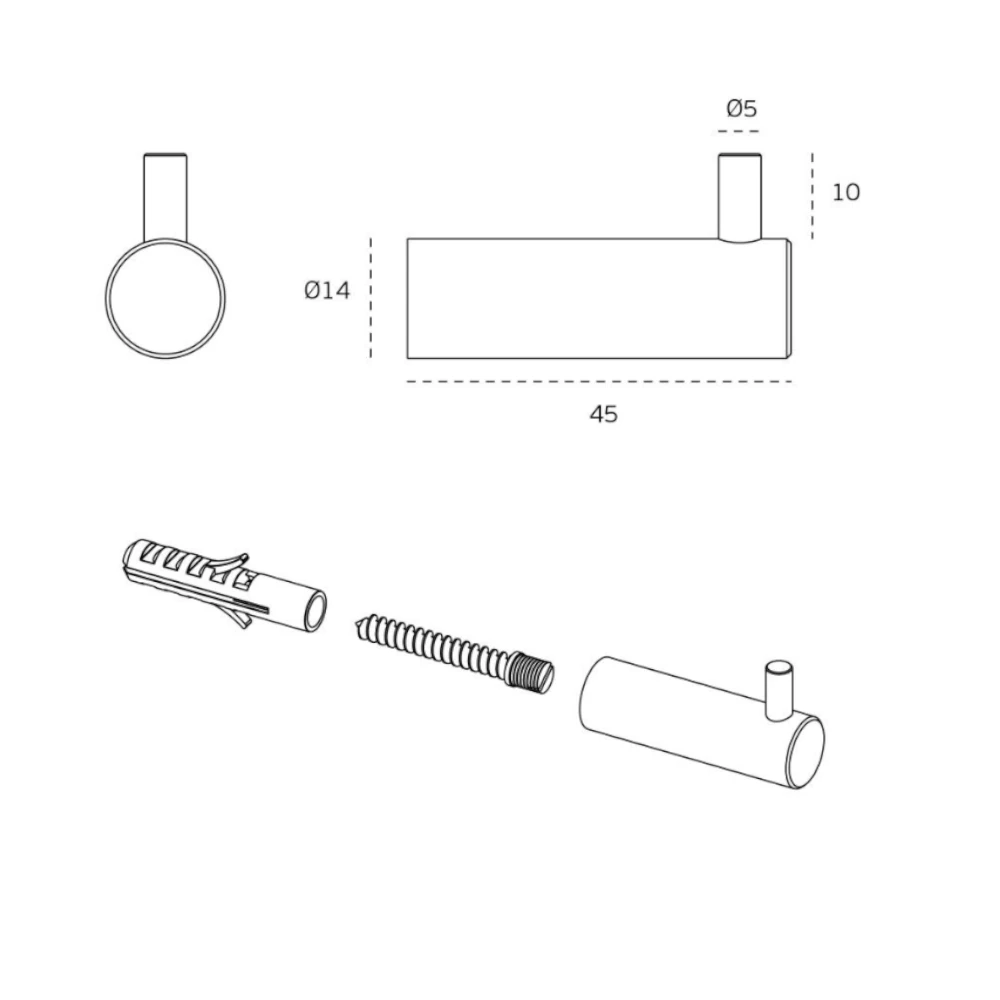 JNF serie Fine kapstokhaak met haakje, lengte 45 mm, 14 mm rond, RVS-geborsteld