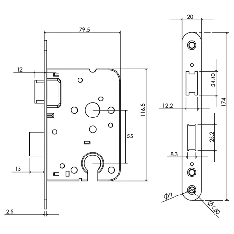 Mauerlocks serie 1535 cilinder d+n slot doornmaat 50mm pc maat 55mm met RVS ronde voorplaat 170x20mm incl sluitplaat links en rechts omkeerbaar