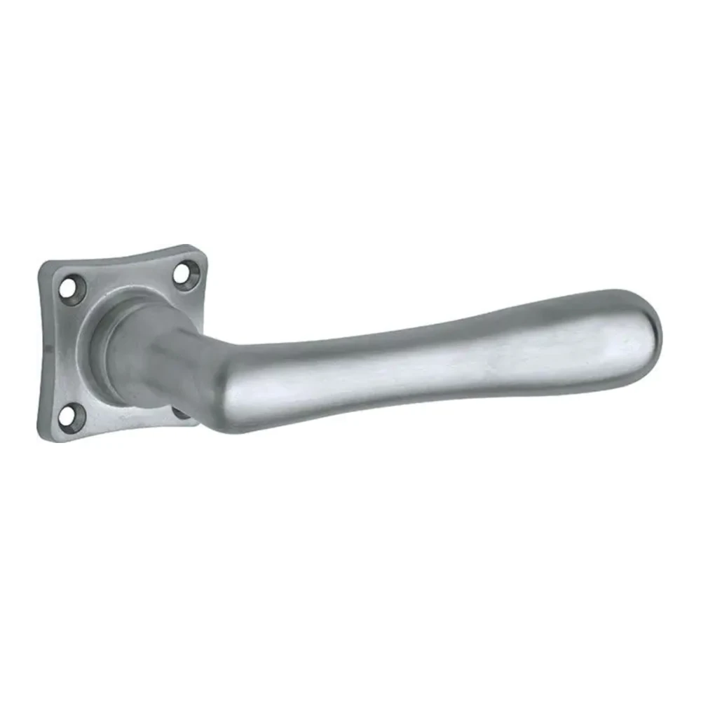 Mi-Satori deurbeslag, serie Linea deurkruk met vierkante kruk rozet, schroeven zijn zichtbaar. Uitvoering Chroom-mat.