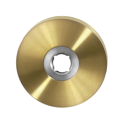 De ronde rozet is uitgevoerd in PVD messing satijn. Hij heeft een diameter van 50 mm en is 8 mm hoog.