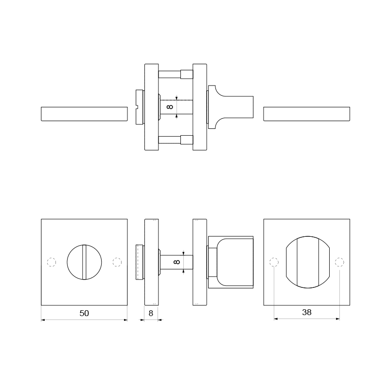 Toiletgarnituur 50x50x8mm stift 8mm PVD antraciet grote knop